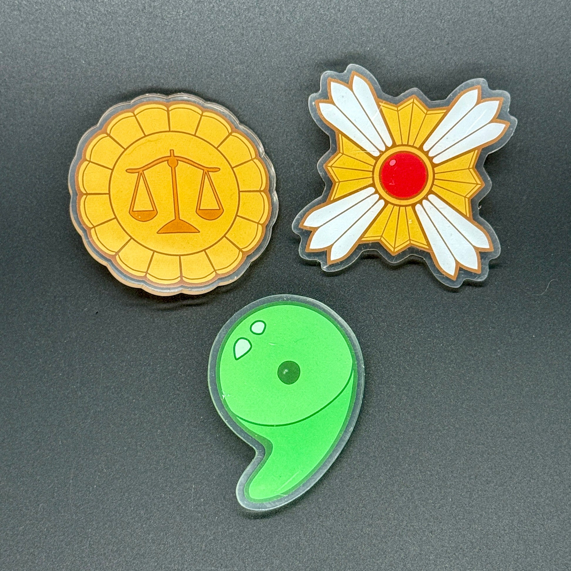 Acrylic pins of the Defense Attorney badge, the Prosecutor badge, and the Magatama from Ace Attorney!