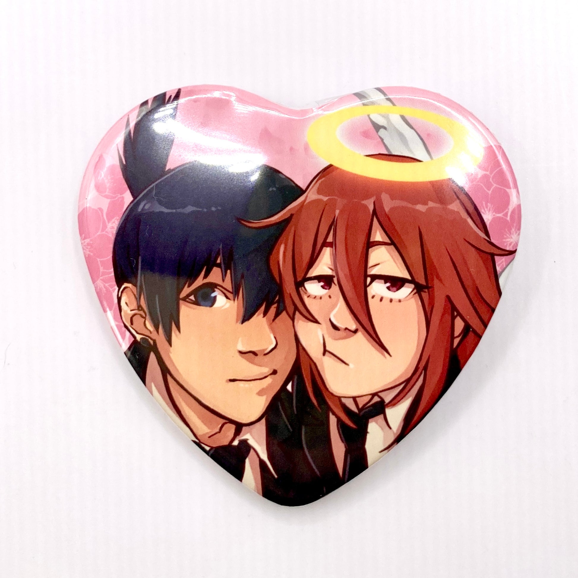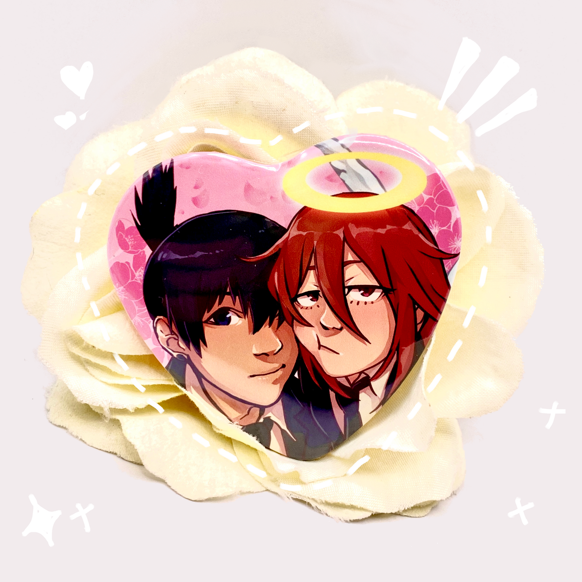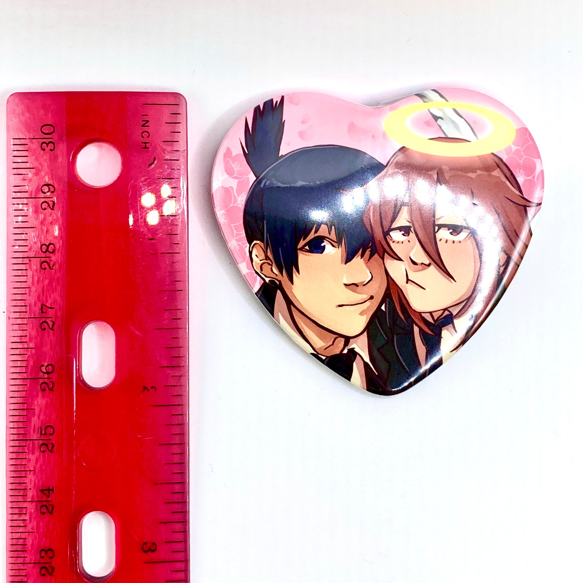 Each button is made with a metal pin backing and measures 5.5 cm tall and 6 cm wide. A protective mylar film is used to protect the artwork, giving each button a nice glossy finish.