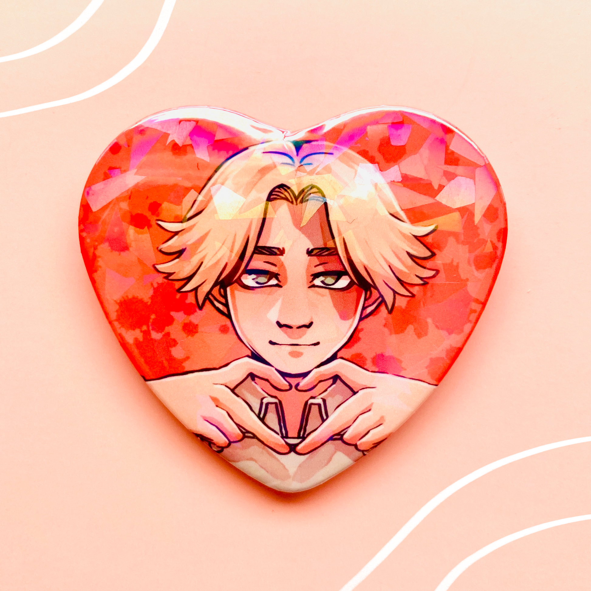 Each button is made with a metal pin backing and measures 5.5 cm tall and 6 cm wide. A protective laminate film is used to protect the artwork, giving each button a nice holographic finish.